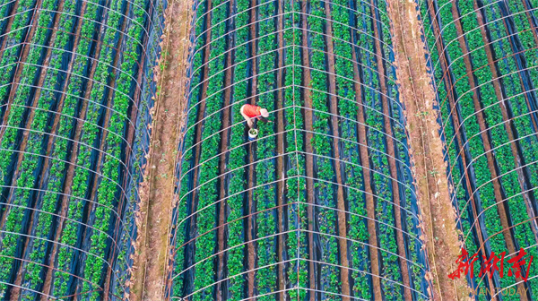 在冷水滩区珊瑚街道水汲江社区草莓种植基地,农户们穿梭田间为草莓苗覆盖保温膜。这样既能锁住土壤水分、抑制杂草生长,又能抵御冬日低温侵袭。