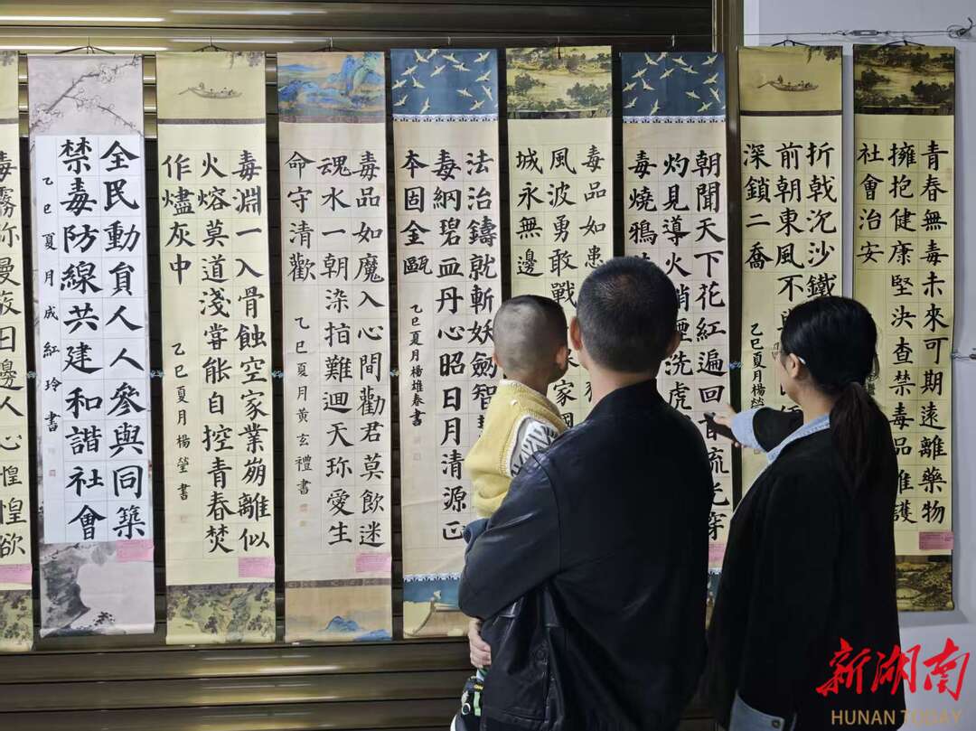 “毒品无情,生命可贵”“一朝染毒百花凋”“天下无毒”……一幅幅书法作品沿展厅四周铺陈开来,有的端庄秀美、有的遒劲有力,读来朗朗上口、通俗易懂,将禁毒知识展现得淋漓尽致。禁毒宣传融入黑白韵律,秒变艺术珍品,人们驻足赏析、品评交流,其乐无穷。