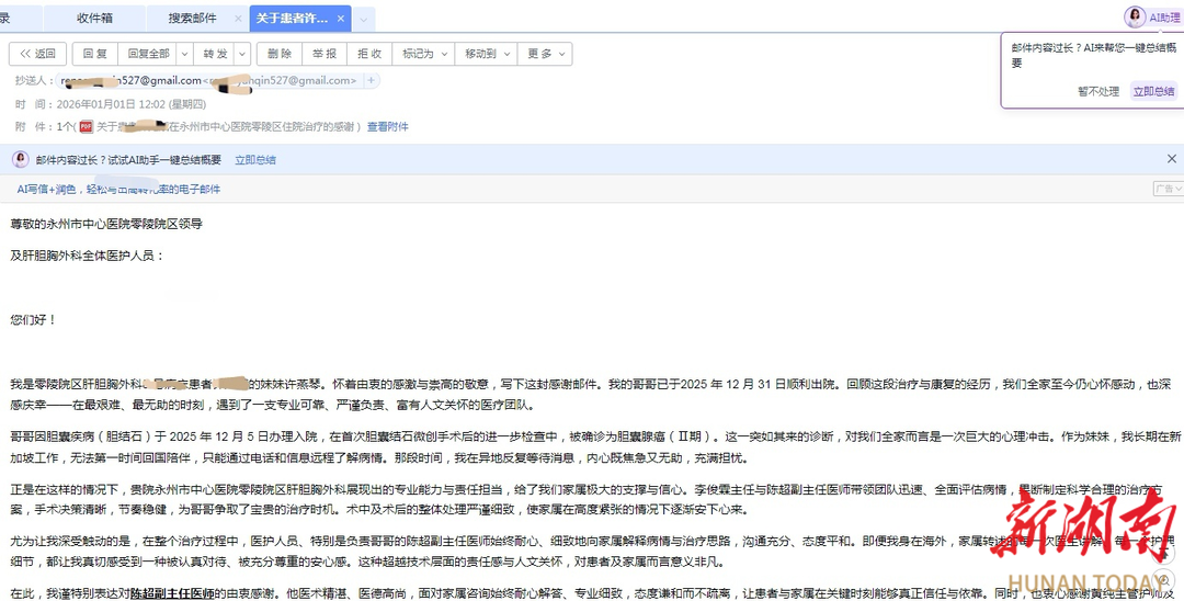 湖南日报·新湖南客户端1月26日讯(通讯员 刘宝玉)近日,永州市中心医院收到一封特别的电子邮件,它跨越数千公里,自新加坡而来。写信人许燕琴女士的哥哥许先生,曾在该院零陵院区肝胆胸外科住院接受治疗。在这封情真意切的感谢信中,许女士回顾了其兄长从确诊到康复的难忘历程,字里行间满载着对市中心医院医疗团队专业精神与人性化服务的由衷感激与高度赞誉。