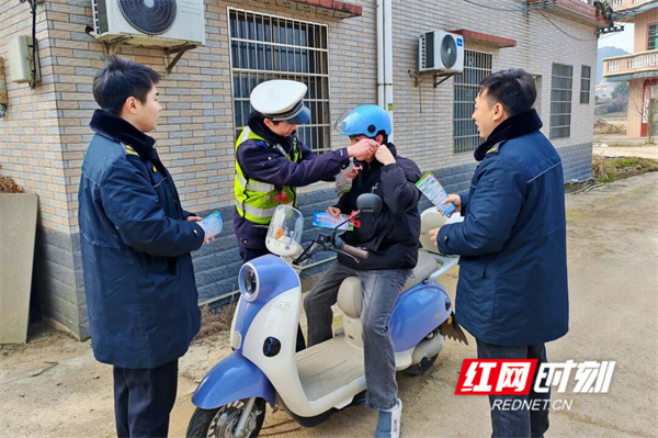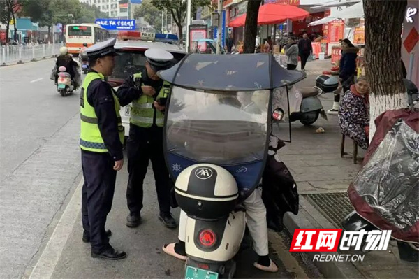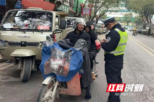 执勤交警结合春运首日交通流量特点,在城区主干道、客运站周边、集市路口及城乡接合部等重点区域设立执勤点,采取“定点值守+流动巡查”相结合的方式,重点查处驾乘摩托车、电动自行车不戴安全头盔、违规载人、逆向行驶和加装遮阳雨篷等违法行为。