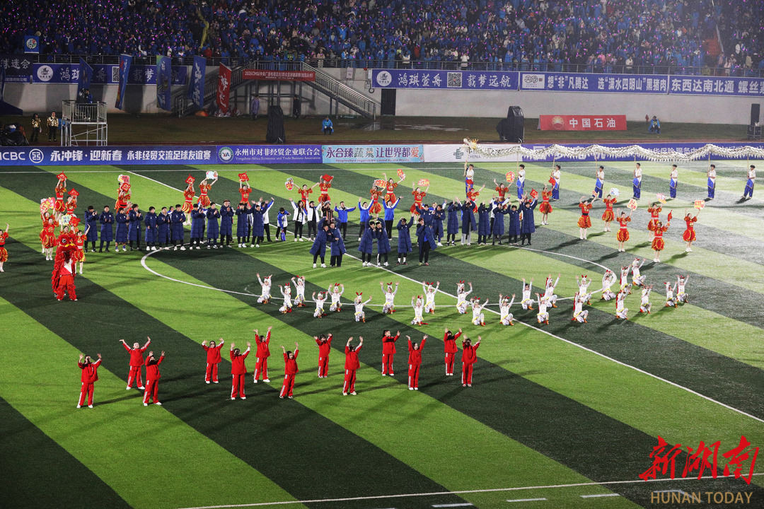 湘超赞助商代表、“央超”球员代表、外地球迷代表、海内外永州人也向晚会发来拜年视频。与永州有经贸合作关系的非洲国家友人带来奔放热烈的鼓舞节目《燃情非洲》,展示了质朴的热情与力量。随后,永州健儿与非洲友人展开了一场精彩的永非经贸交流足球友谊赛。非洲足球队员来自几内亚、多哥、尼日利亚等19个国家,包括7名参加过非洲国家杯(AFCON)及非洲国家锦标赛(CHAN)的“国脚”。经过激烈角逐,永州队在最后一刻追平比分,双方2比2战平。球赛结束后,晚会在温馨的《相亲相爱一家人》全场互动歌舞中落下帷幕。
